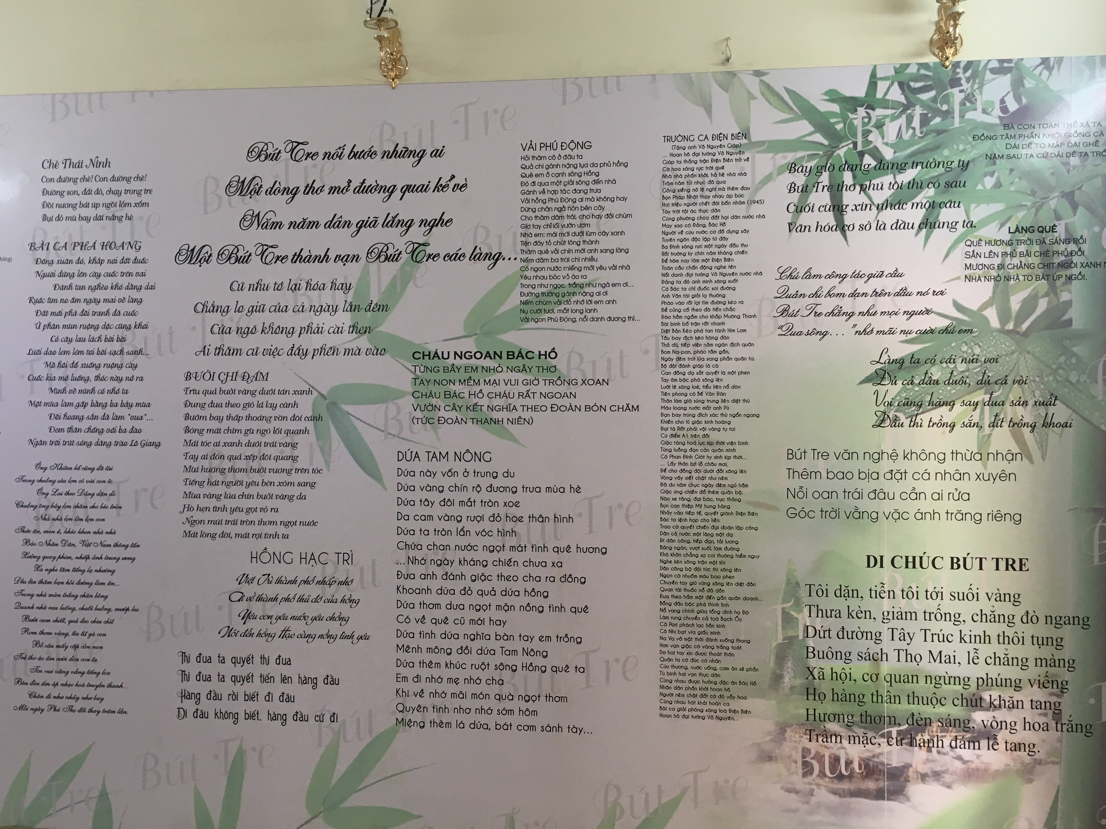 Bên trong phòng trưng bày, điểm nổi bật nhất của Khu lưu niệm là nơi du khách được ngắm nhìn những hiện vật, sách báo, đồ dùng sinh hoạt và kỷ vật gắn liền với hoạt động cách mạng, công tác và cống hiến của Ông, cùng đọc từng bài thơ in trên bức tường thơ. Đây sẽ là địa chỉ đỏ để văn nghệ sĩ, du khách, nhân dân yêu thích thơ Bút Tre đến thăm cũng như tìm hiểu thêm về cuộc đời, sự nghiệp của ông.
