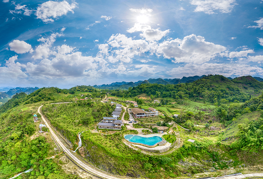 Bakhan Village Resort ở bản Ba Khan, xã Tân Mai, tỉnh Phú Thọ nơi có dòng Đà Giang ngày đêm đổ nước, những ngọn đồi, rừng cây và bể bơi vô cực lớn nhất Tây Bắc.