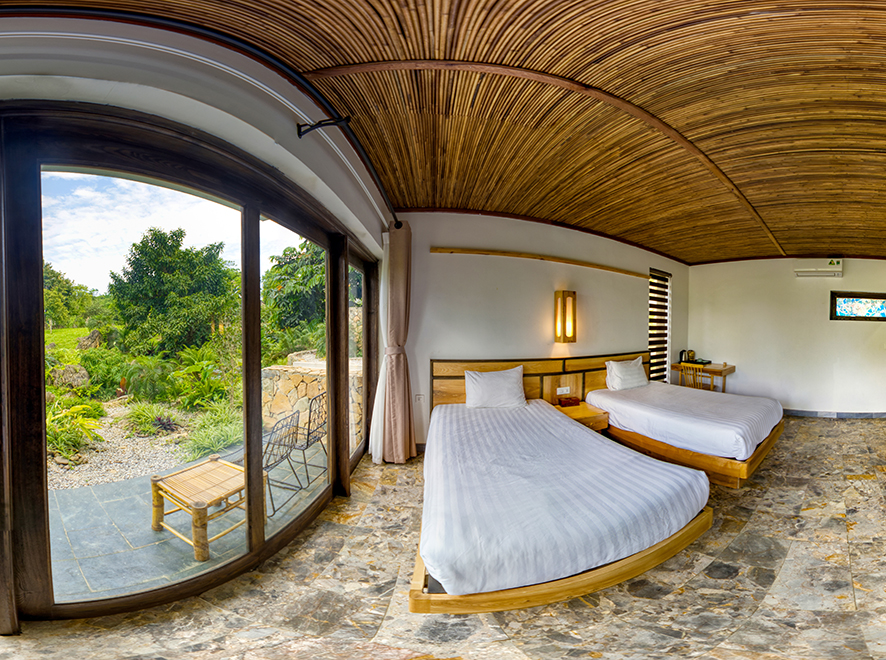 Tất cả các phòng đều có cửa sổ, ban công lớn nhìn ra lòng hồ Hòa Bình, những cánh rừng, vườn hoa hay bể bơi tạo cho du khách một cảm giác thân thiện và gần gũi thiên nhiên. Với nhịp sống chậm, yên bình du khách sẽ được cảm nhận một Sơn Thủy sâu đậm bởi thiên nhiên ban tặng khí hậu mát mẻ quanh năm.