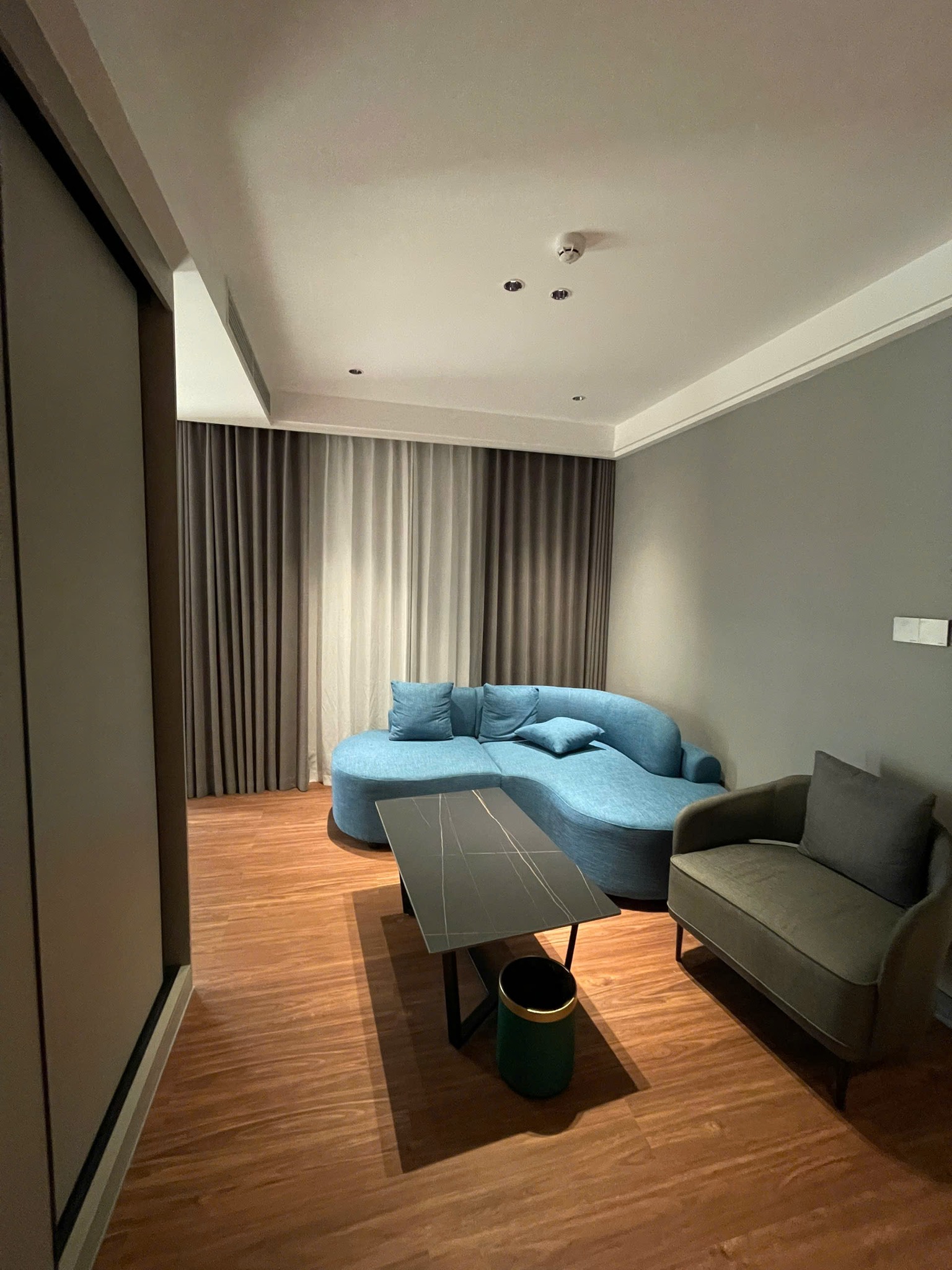 - Góc tiếp khách nhỏ gọn với sofa màu thanh lịch và bàn trà tối giản, lý tưởng để thư giãn.