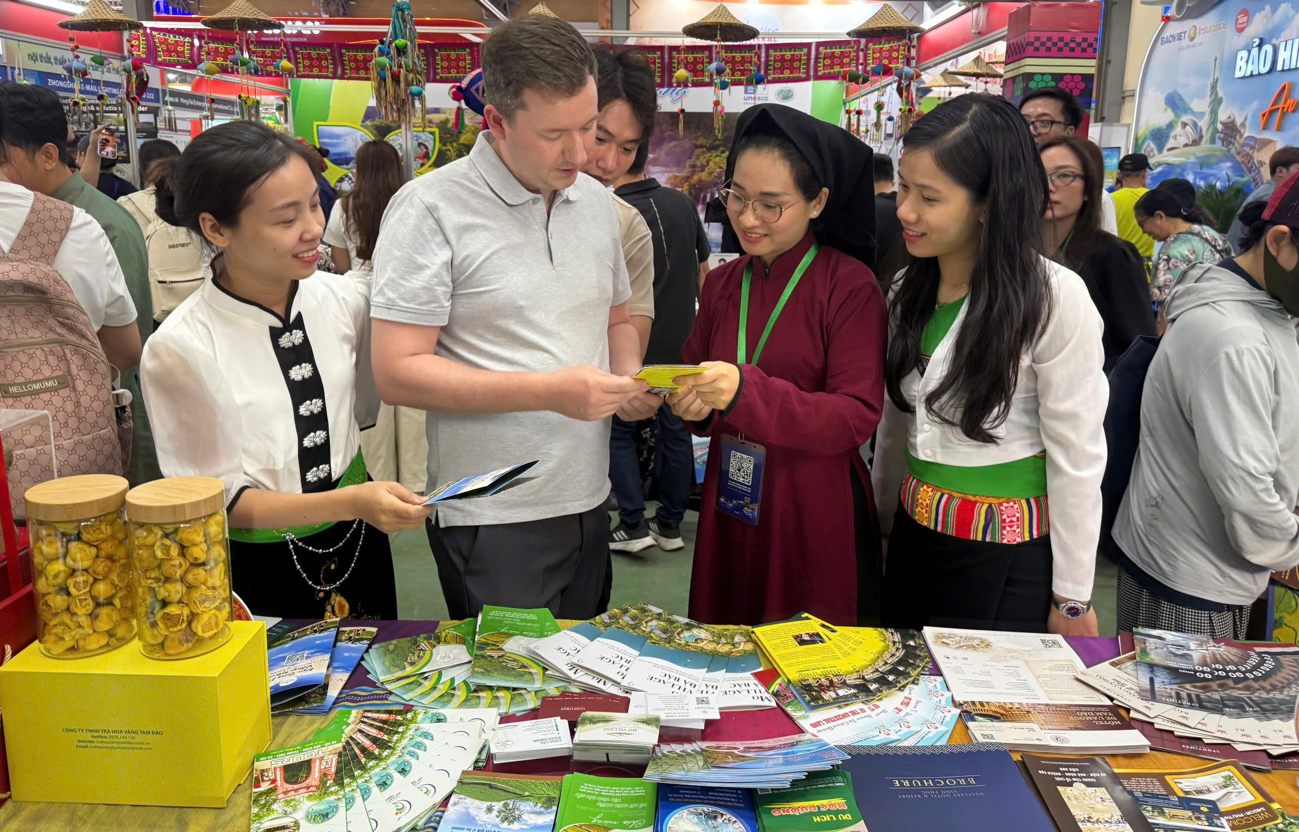 Ngay trong ngày đầu diễn ra Hội chợ, gian hàng trưng bày tỉnh Phú Thọ đã thu hút lượng đông đơn vị xúc tiến du lịch, lữ hành nội địa, công chúng ghé tham quan và tìm hiểu tour du lịch trải nghiệm văn hóa Đất Tổ.