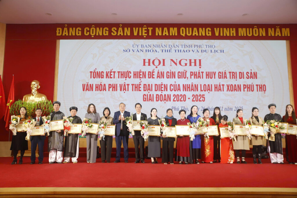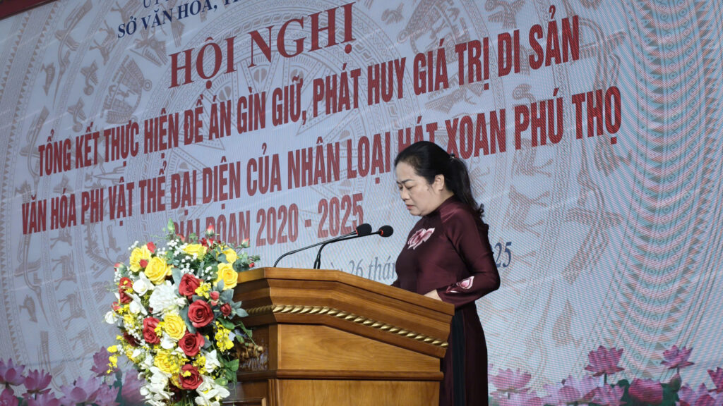 Sáng ngày 26/11/2025, Sở Văn hóa,Thể thao và Du lịch Phú Thọ tổ chức hội nghị tổng kết thực hiện “Đề án gìn giữ, phát huy giá trị di sản văn hóa phi vật thể đại diện của nhân loại Hát Xoan Phú Thọ giai đoạn 2020 – 2025”. Dự hội nghị có đồng chí Nguyễn Viết Cường – Phó cục trưởng cục Di sản văn hóa; đại diện lãnh đạo các sở, ban, ngành và các địa phương.